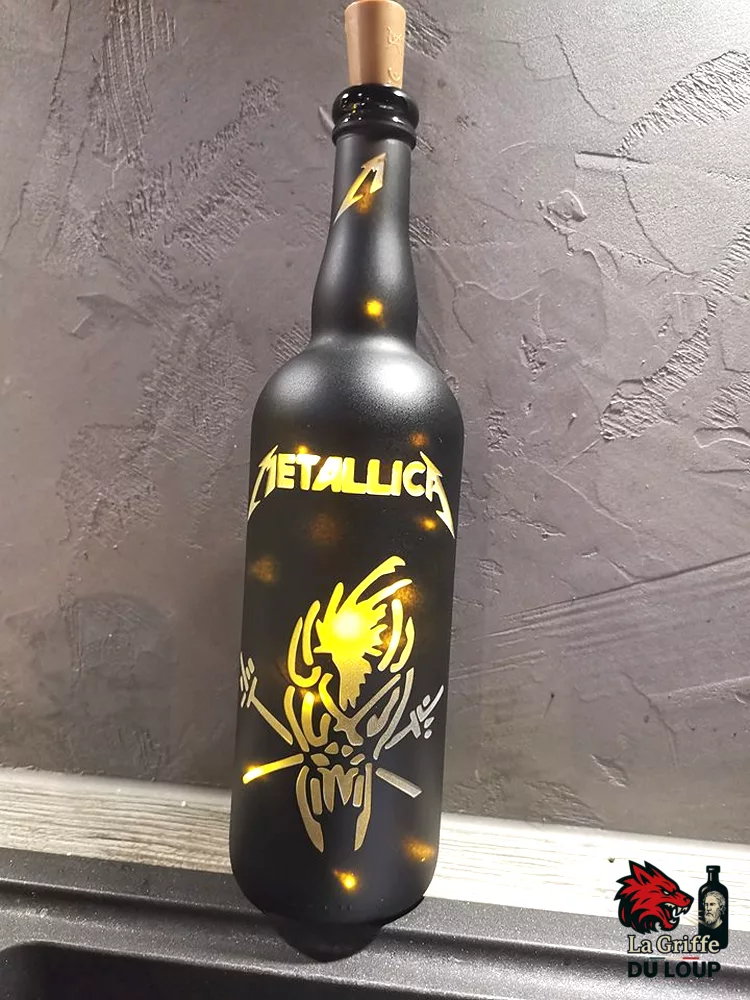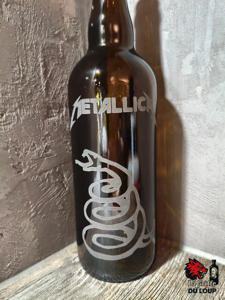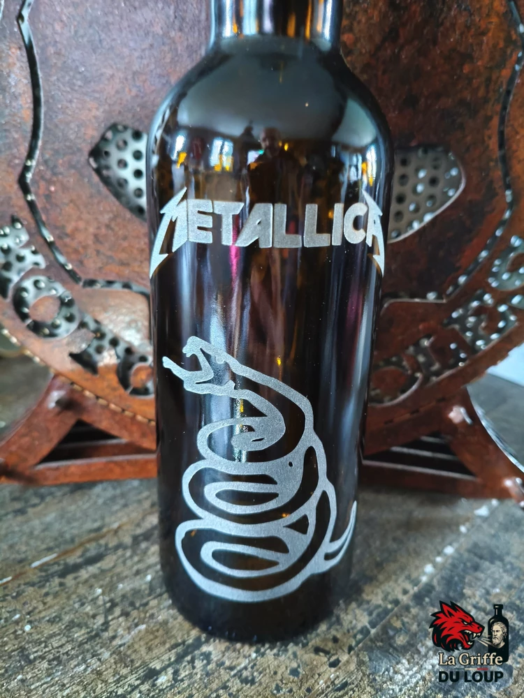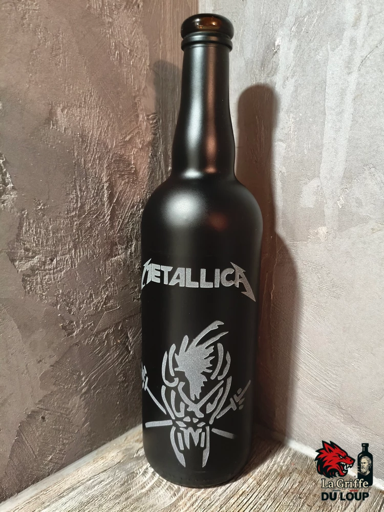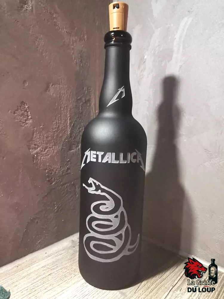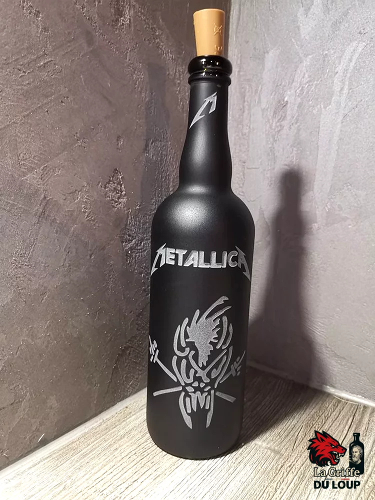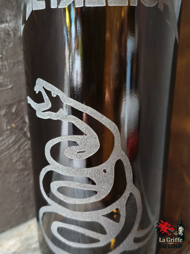 Superbe bouteille décorative gravée Metallica, personnalisée avec différents motifs et finitions.