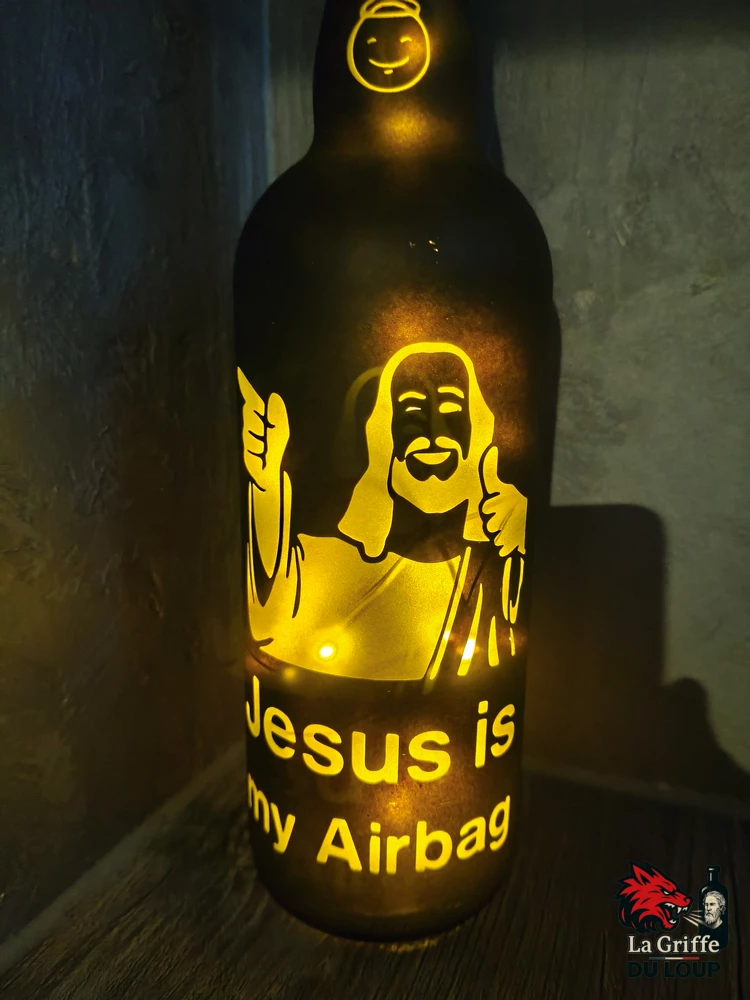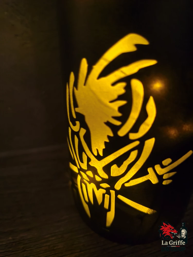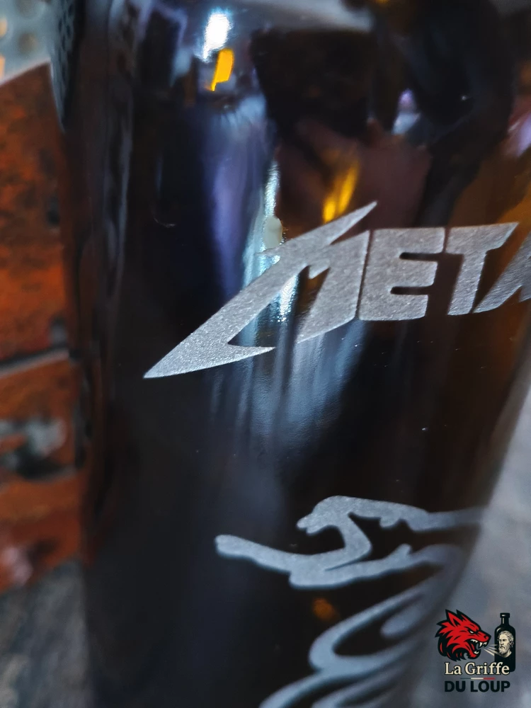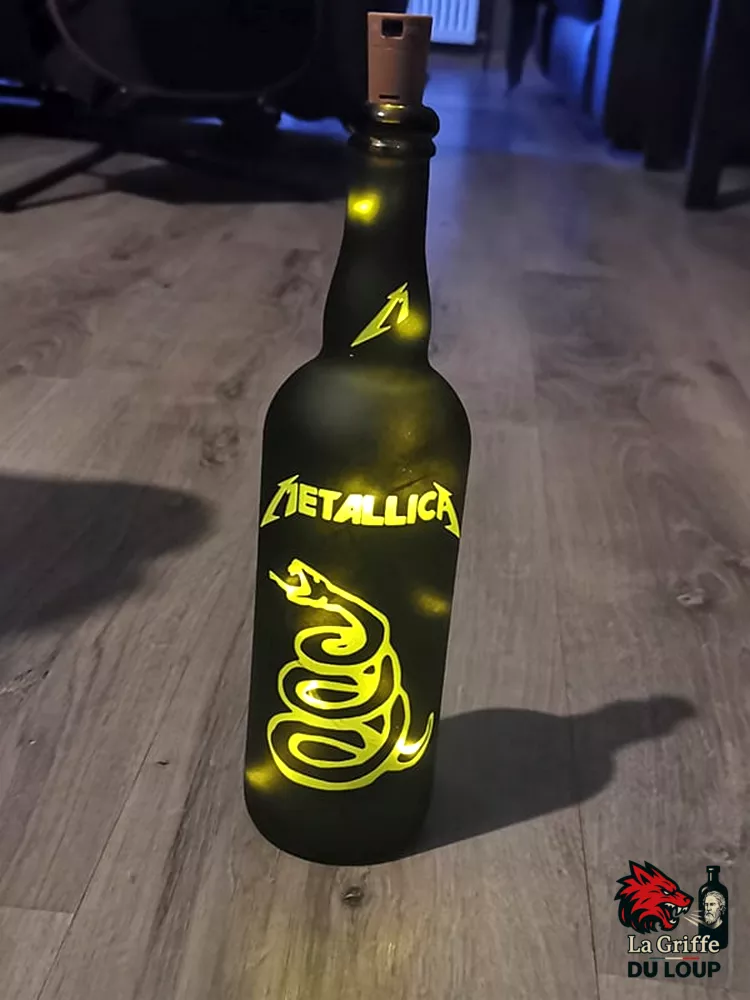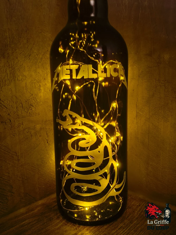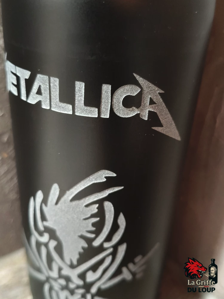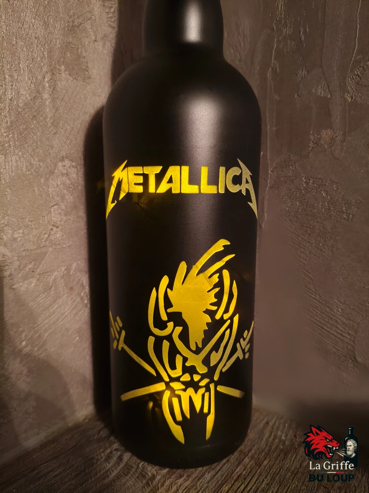 Superbe bouteille décorative gravée Metallica, personnalisée avec différents motifs et finitions.