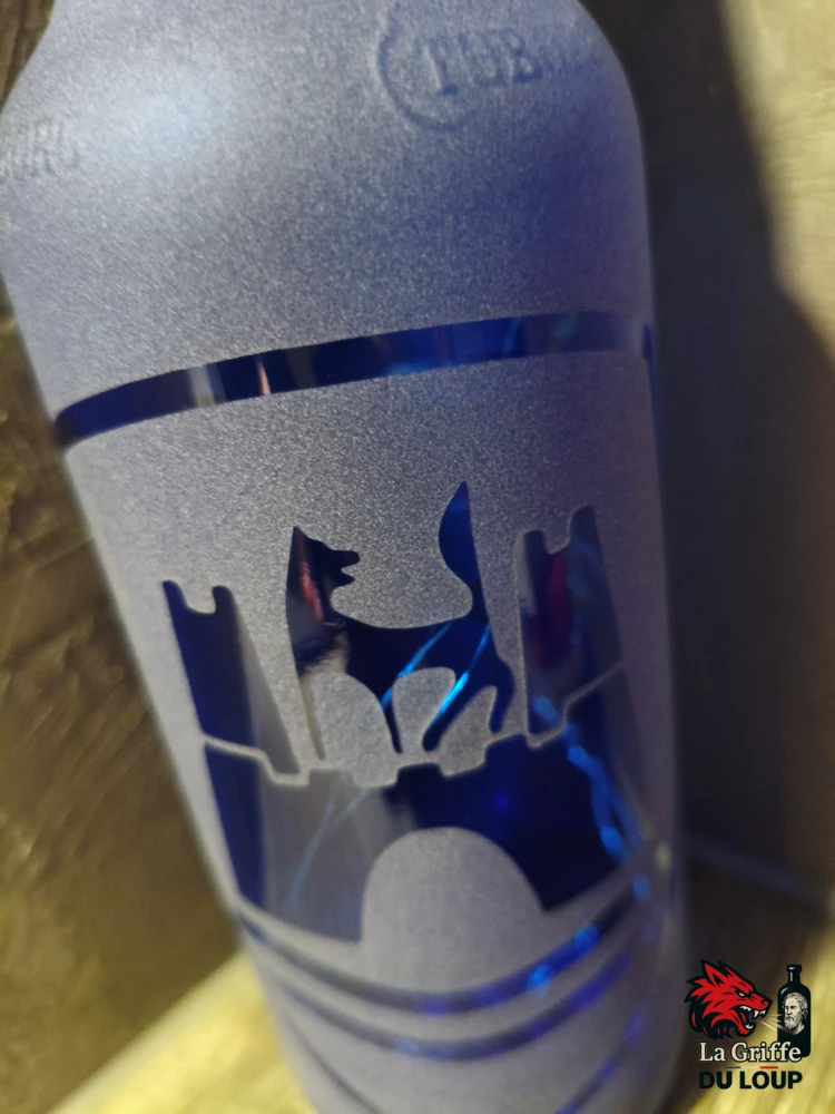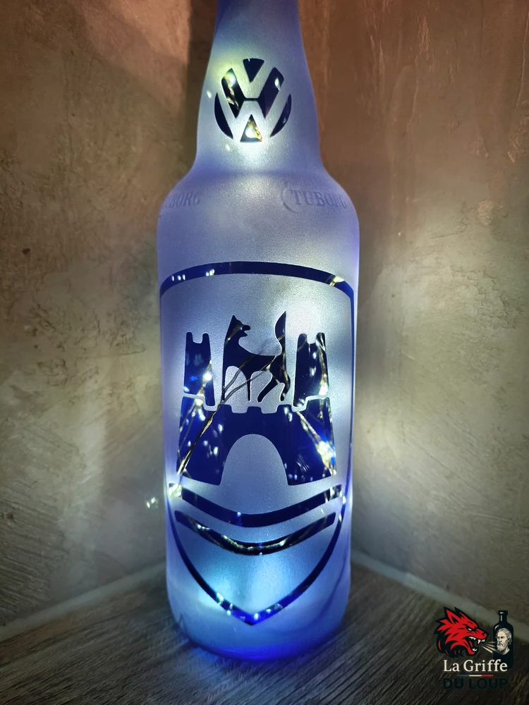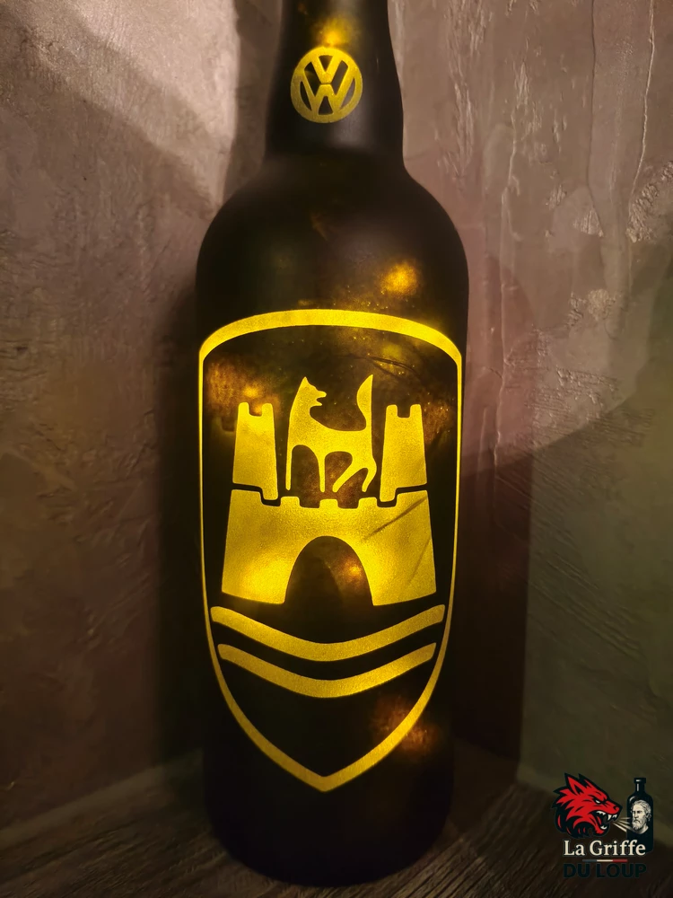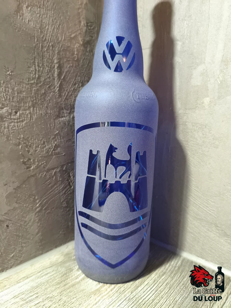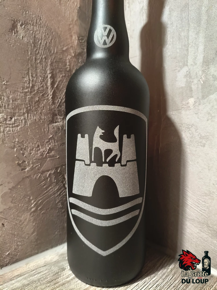 Superbe bouteille décorative gravée VW Wolfsburg, personnalisée avec différentes finitions.
