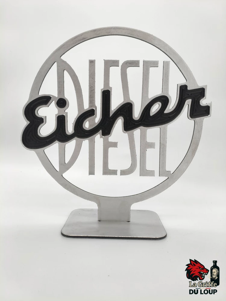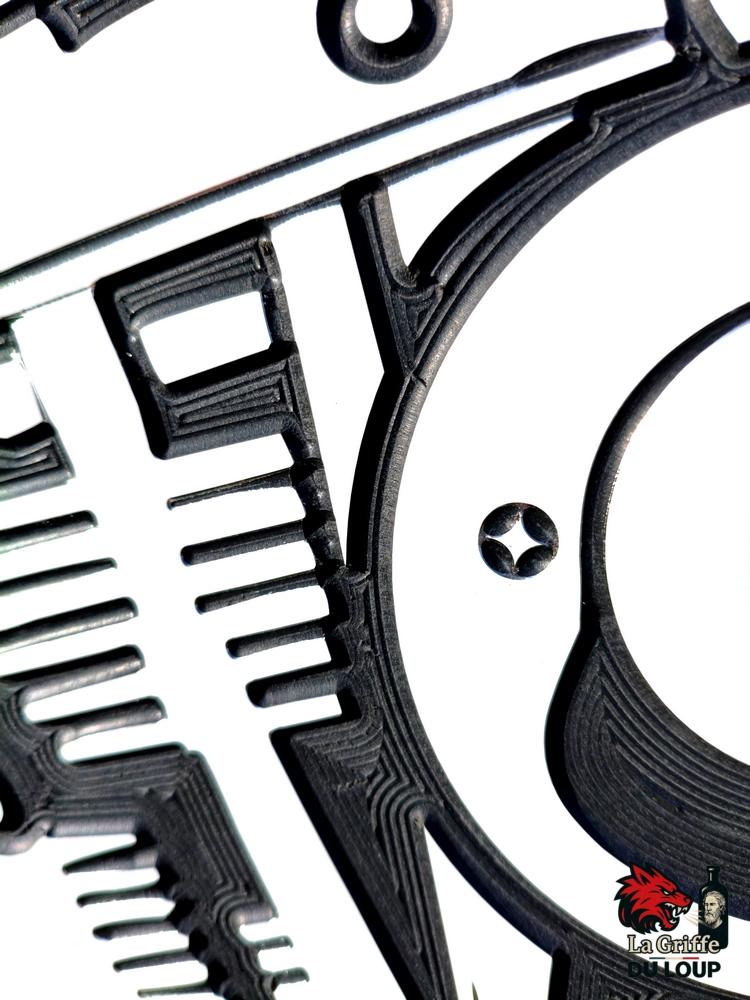 Motif fraisé laissant apparaitre l’âme du matériau en plastique noir.