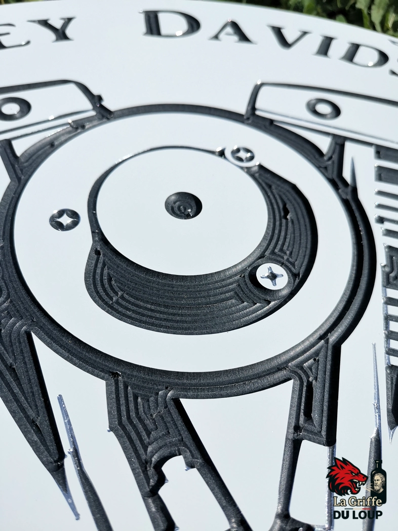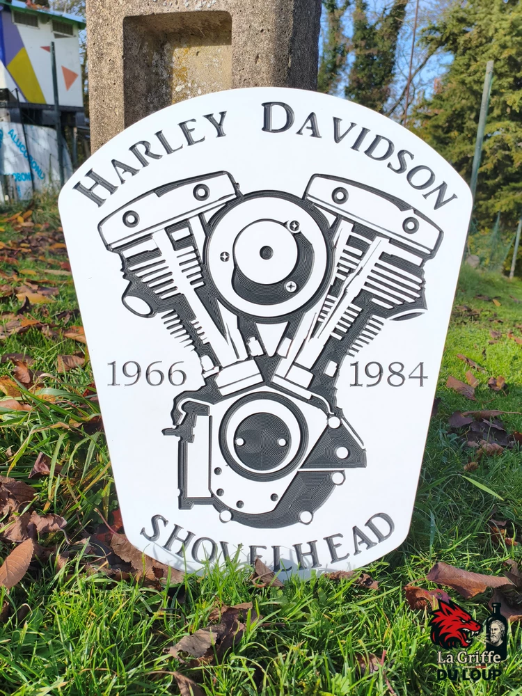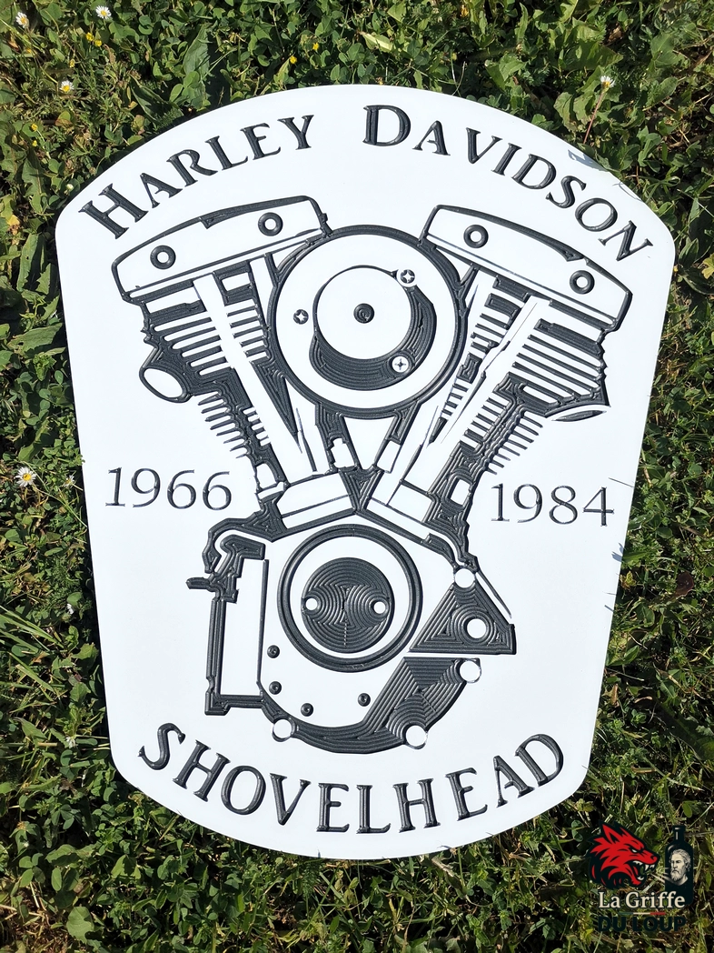 Plaque décorative en aludibond blanc mat à l’effigie du célèbre moteur Harley Davidson!