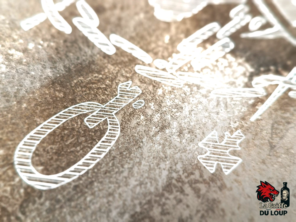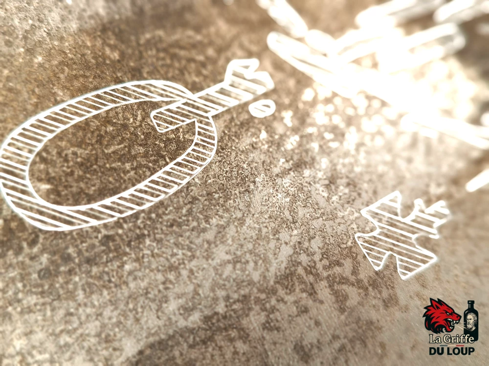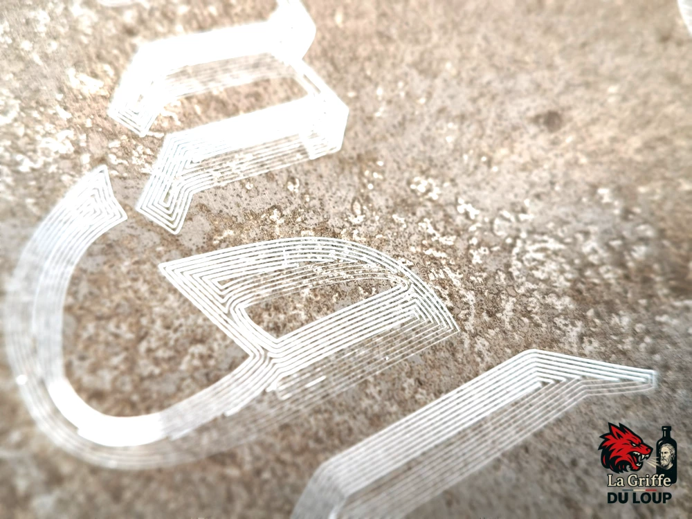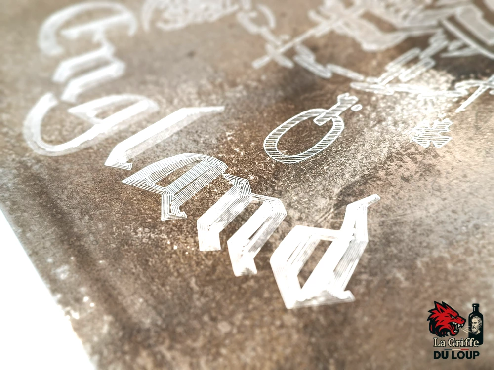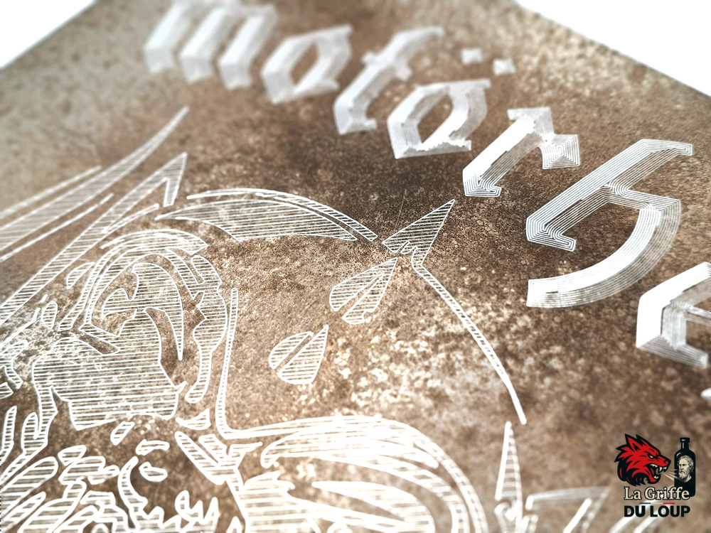 Je l’ai gravée à la pointe diamant ce qui donne un effet visuel incomparable selon l’angle de vue et de la lumière.