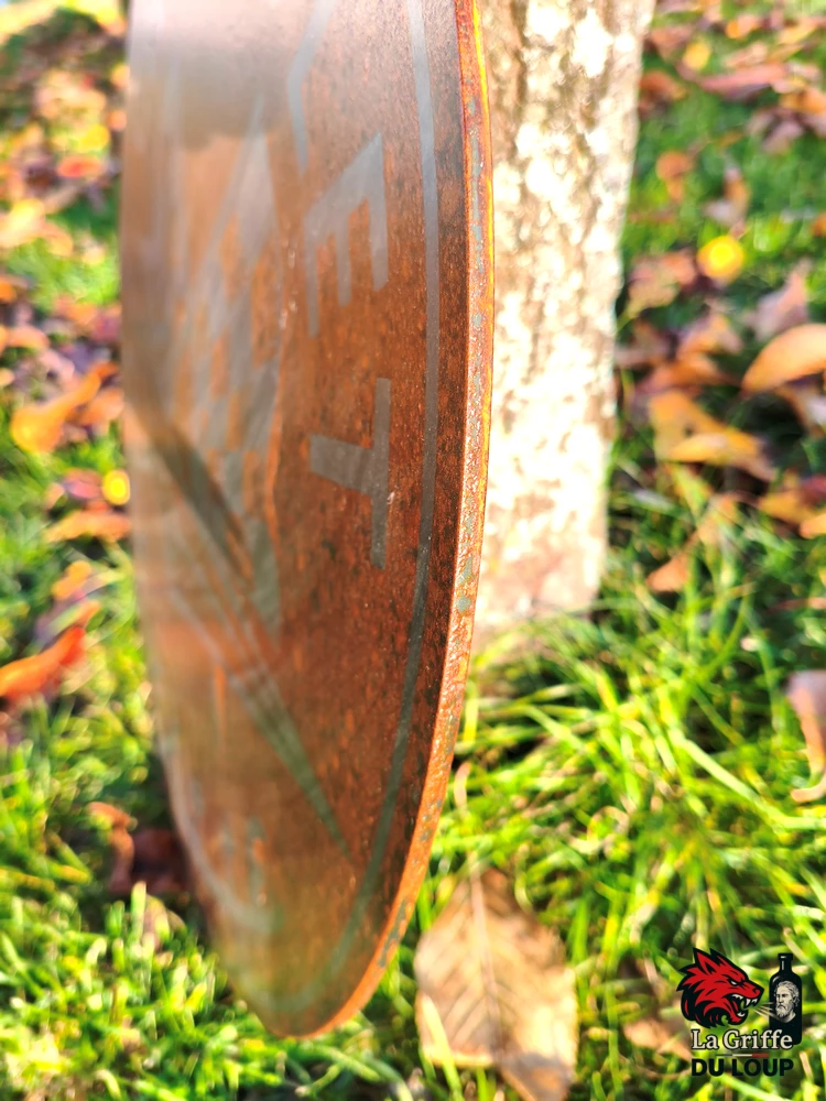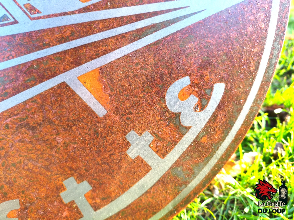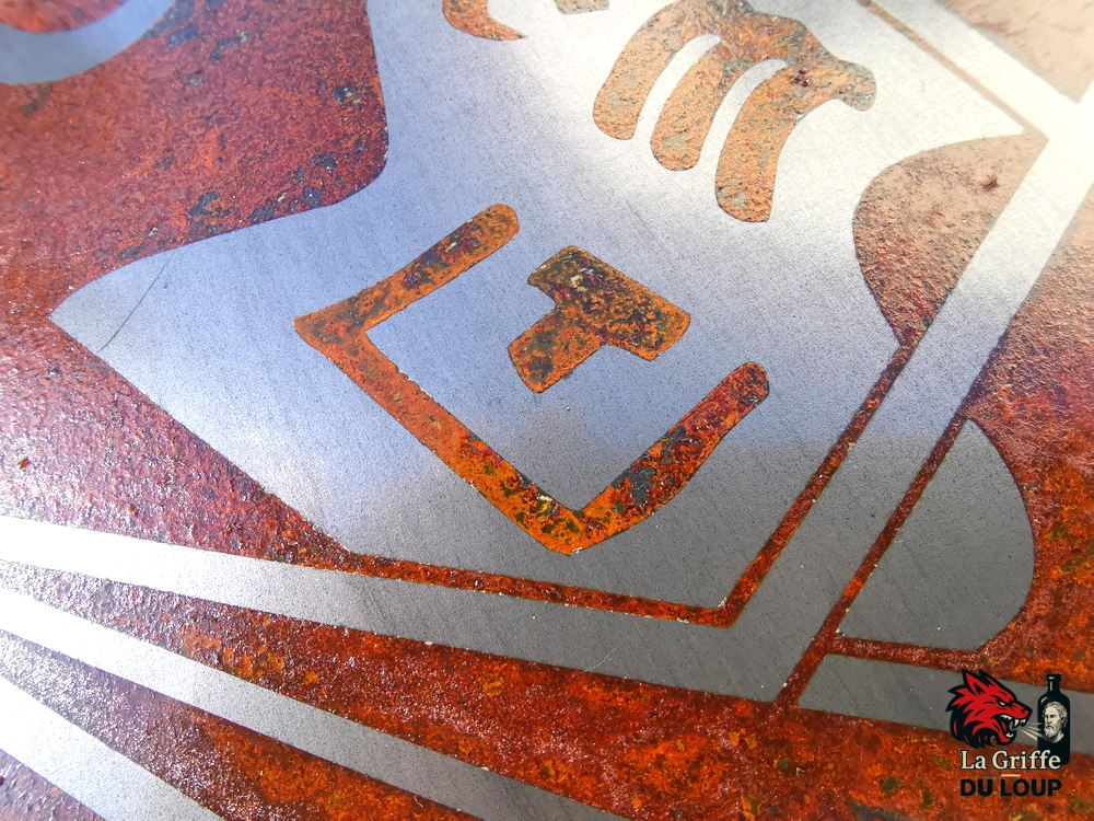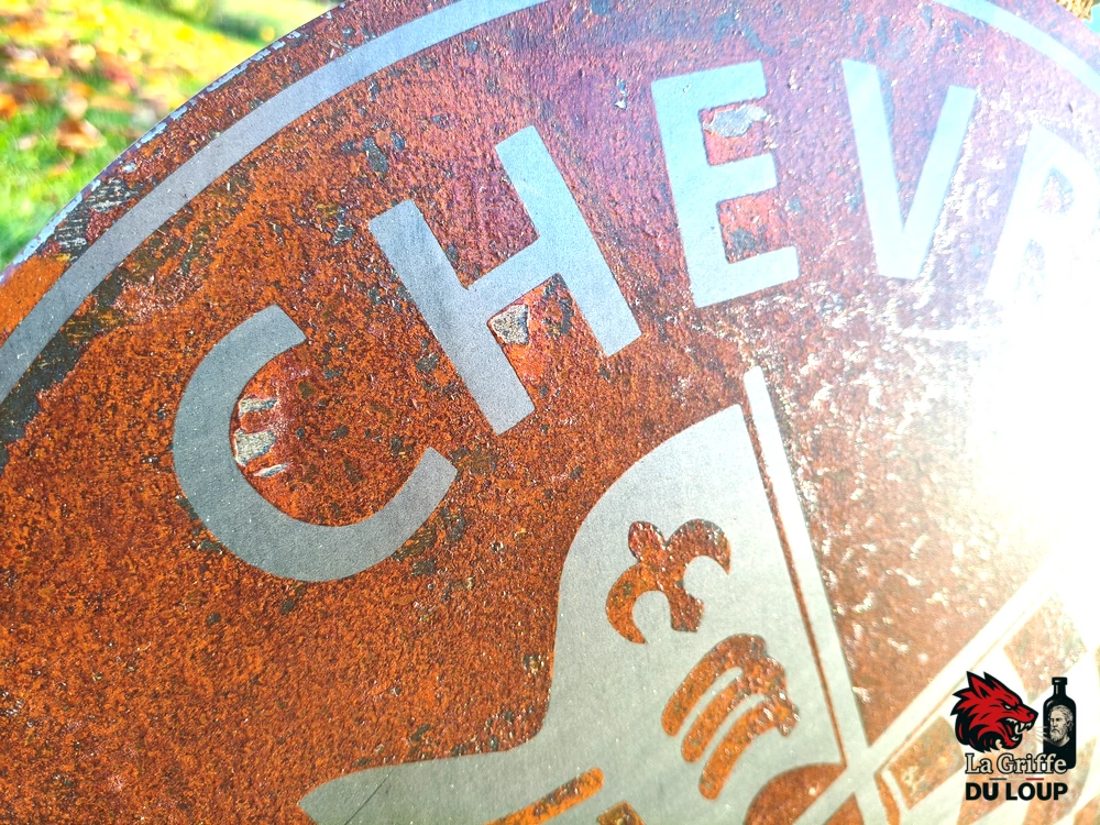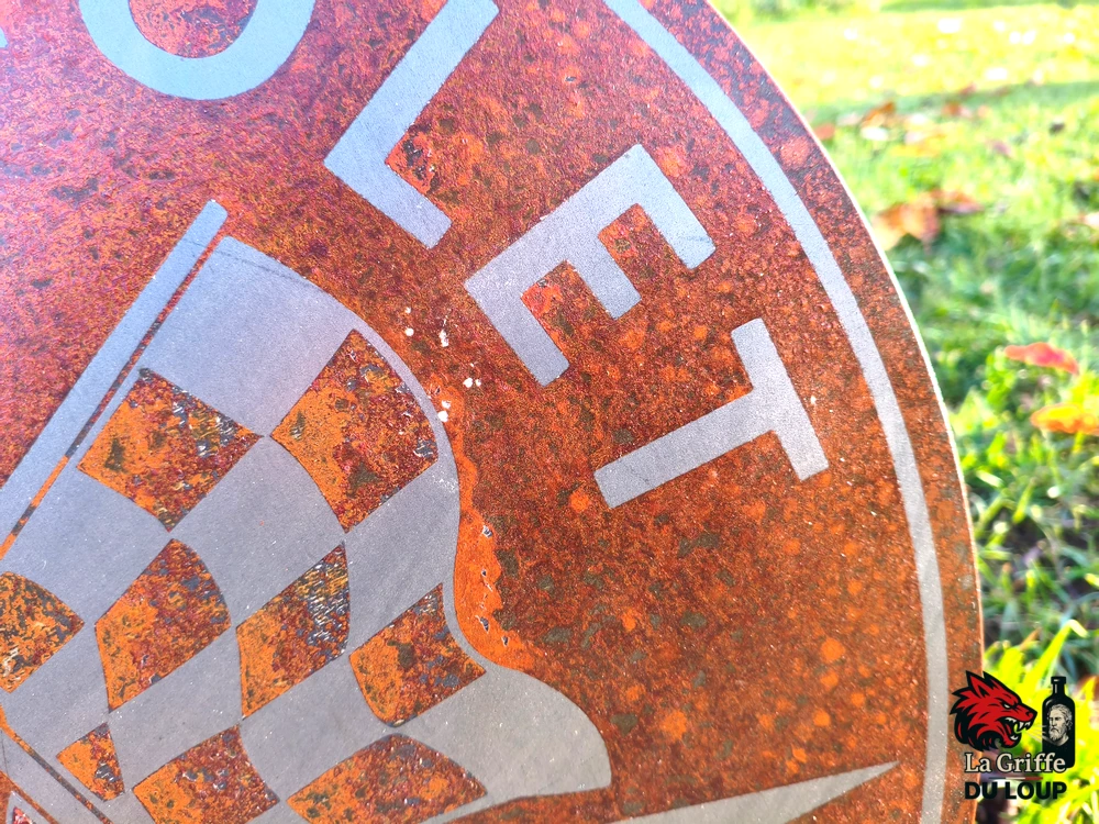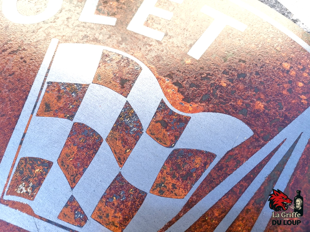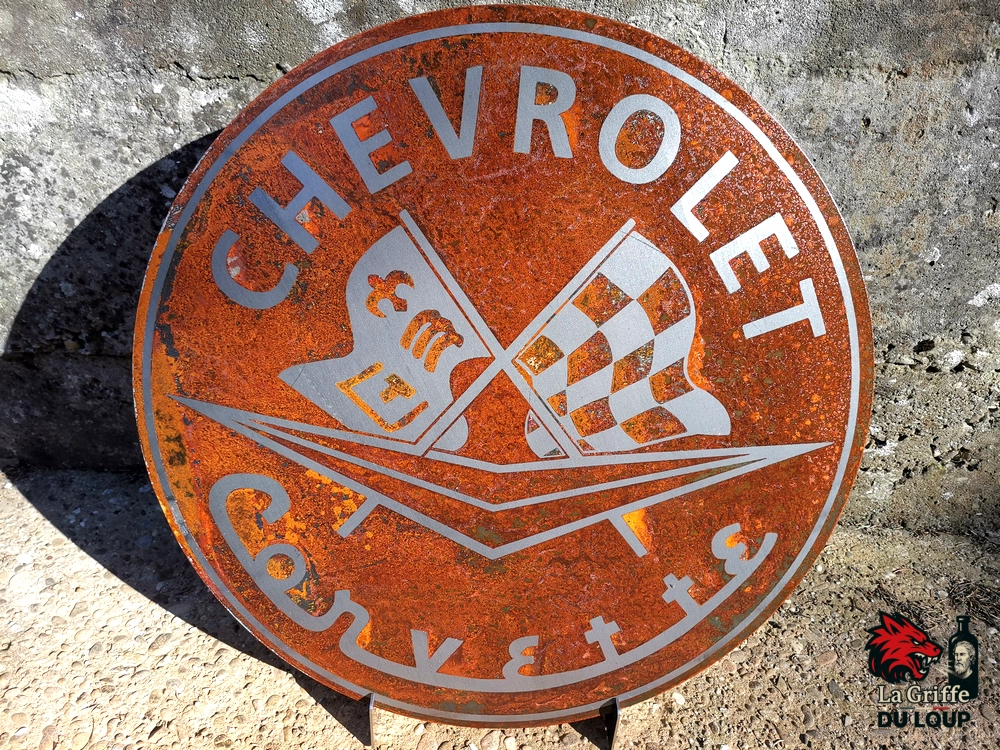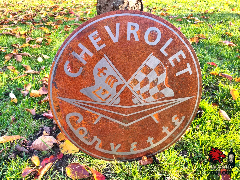 Disque en acier rouillé avec le motif du Chevrolet Corvette en finition brossé, le tout recouvert d’une épaisse couche de vernis stabilisant la rouille!