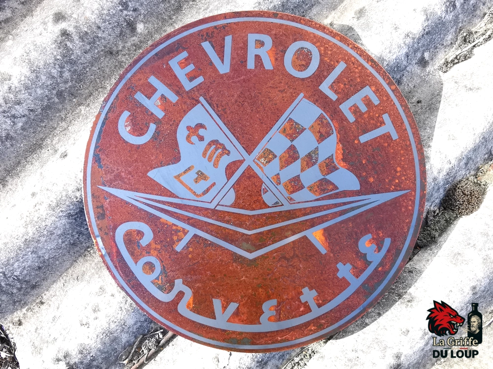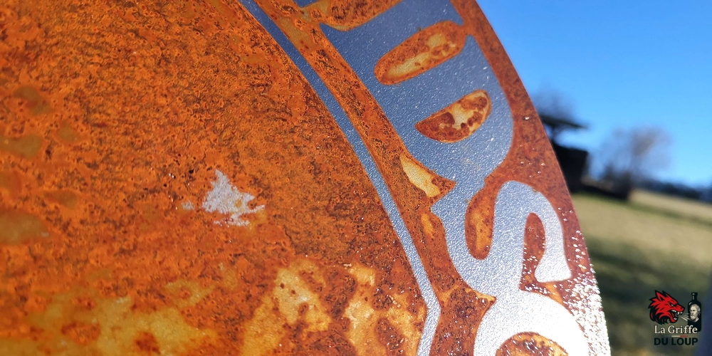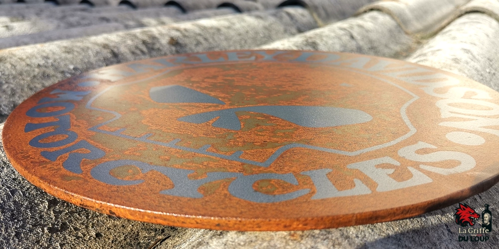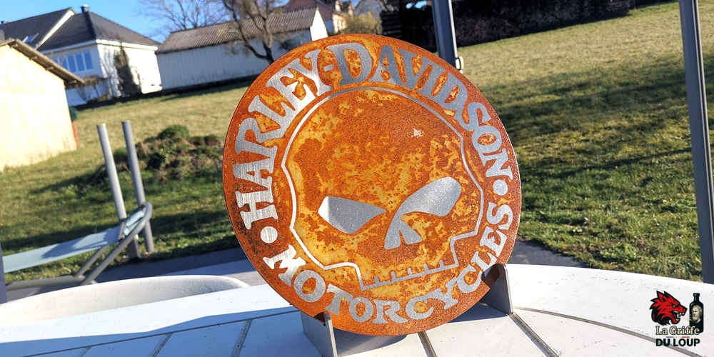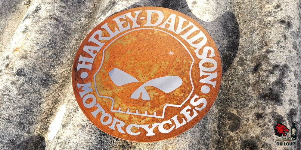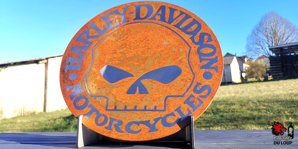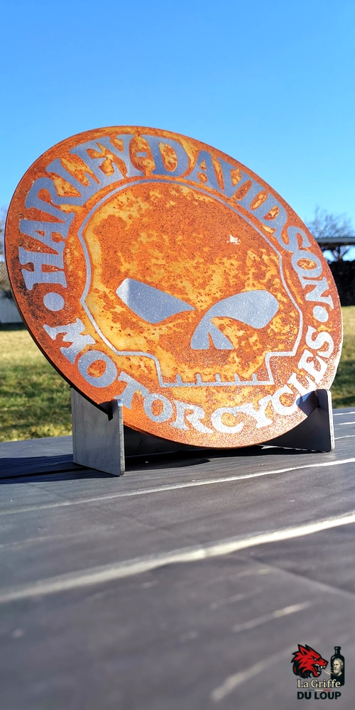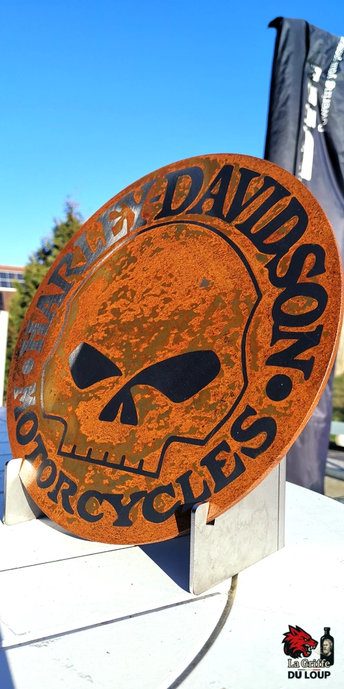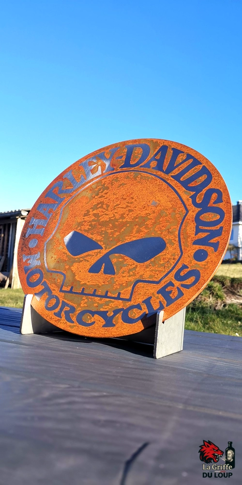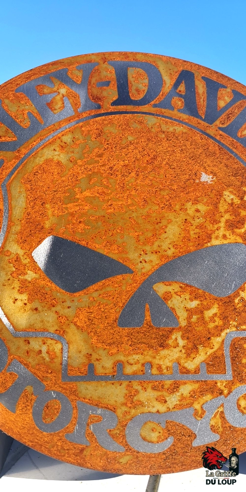Disque en acier rouillé avec le motif Harley Davidson Skull finition brossé, le tout recouvert d’une épaisse couche de vernis stabilisant la rouille!
