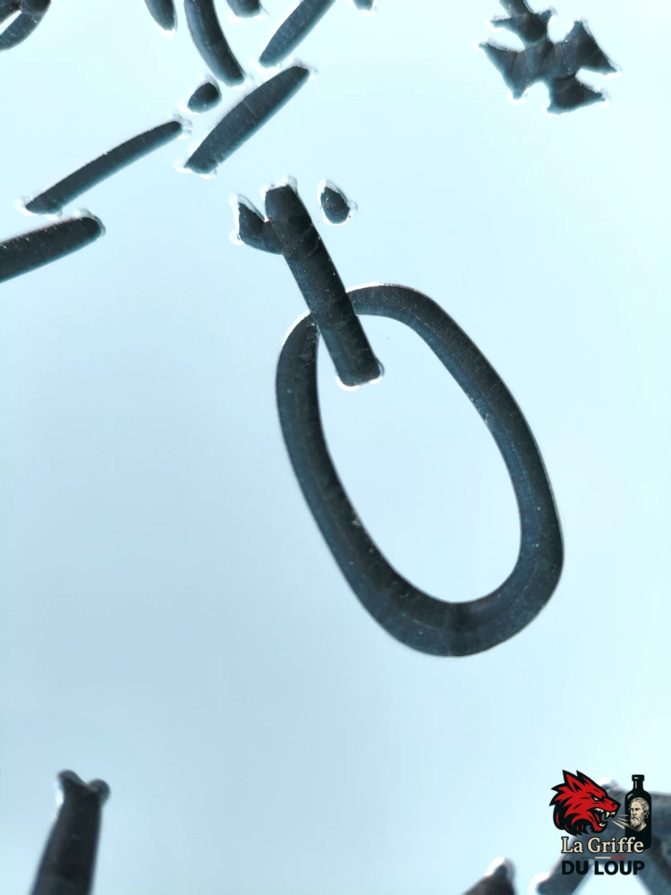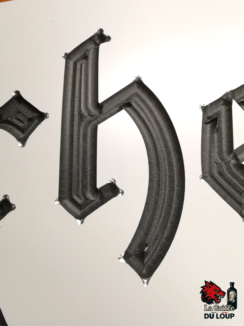 Motif fraisé laissant apparaitre l’âme du matériau en plastique noir.