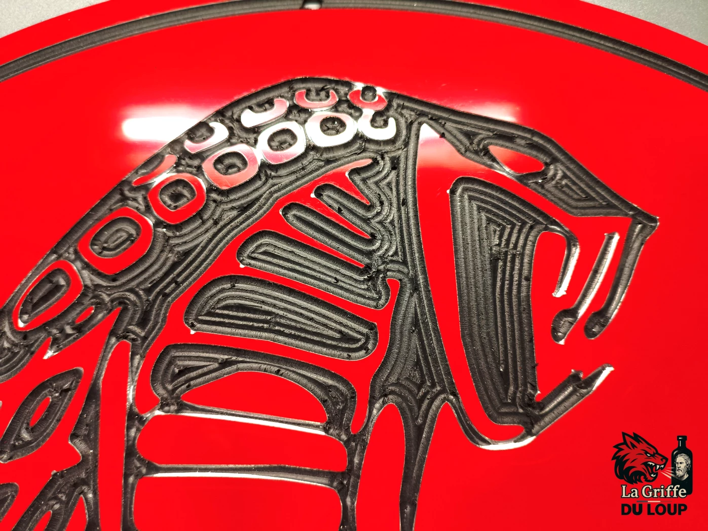 Motif fraisé laissant apparaitre l’âme du matériau en plastique noir.
