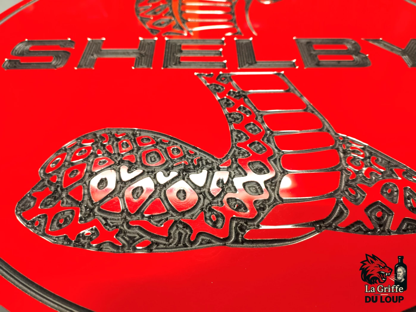Plaque décorative en aludibond rouge brillant à l’effigie du célèbre cobra présent sur certaines voitures Ford sur vitaminées!