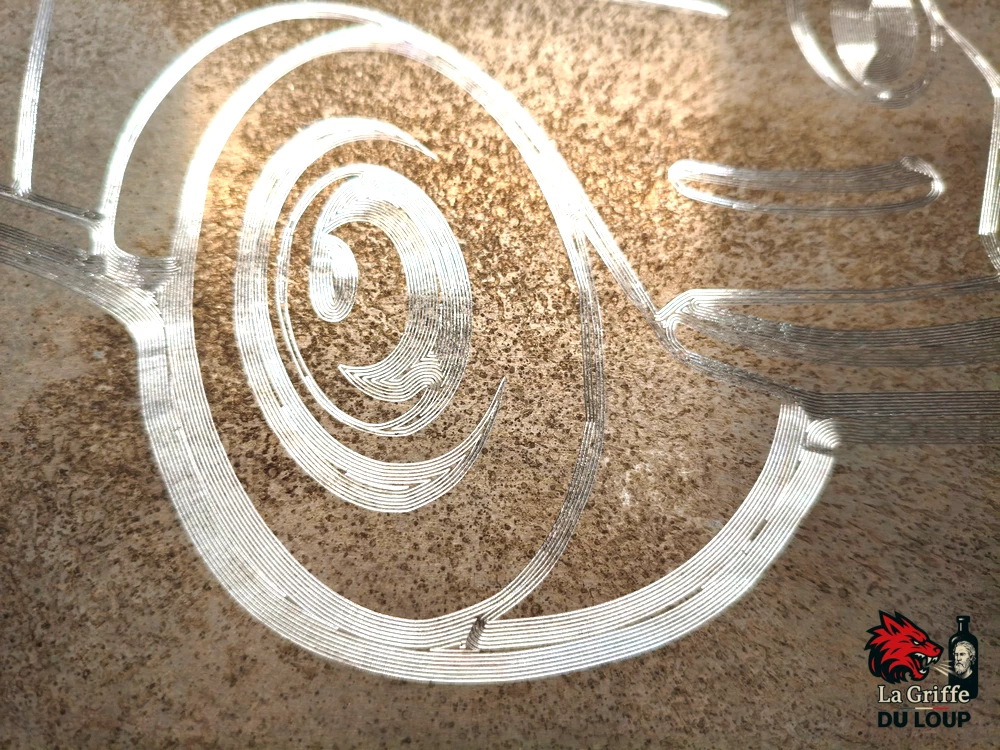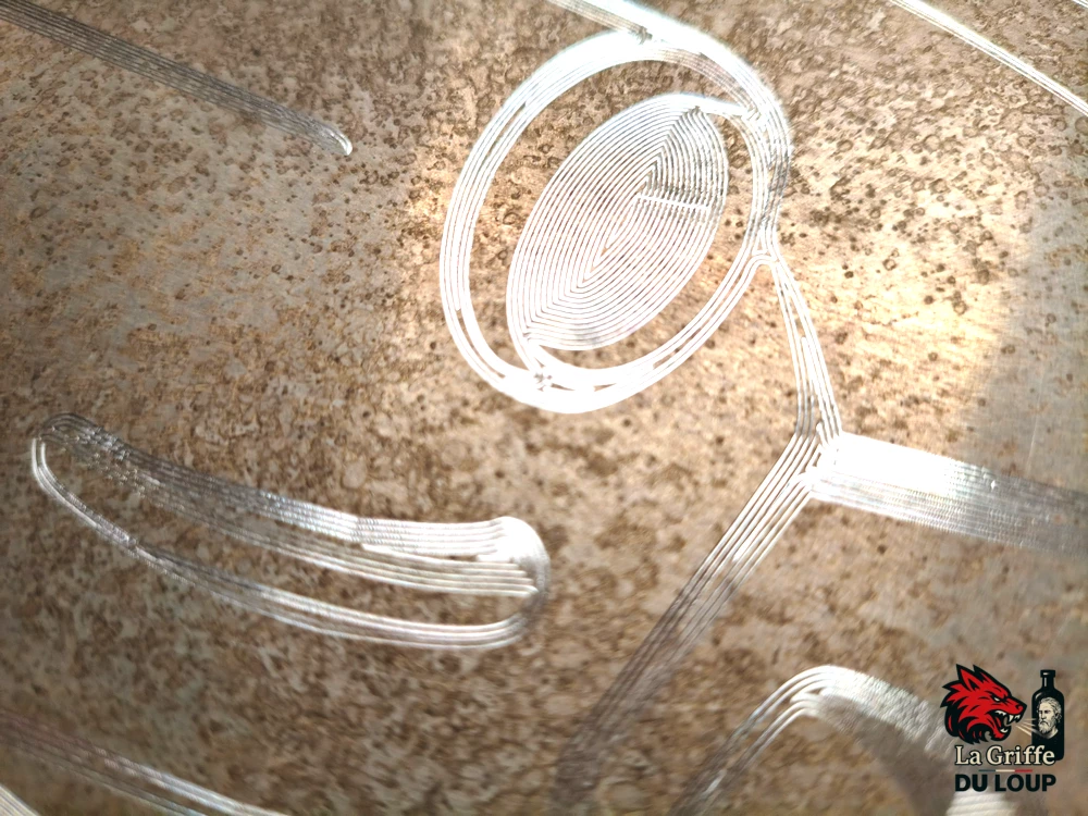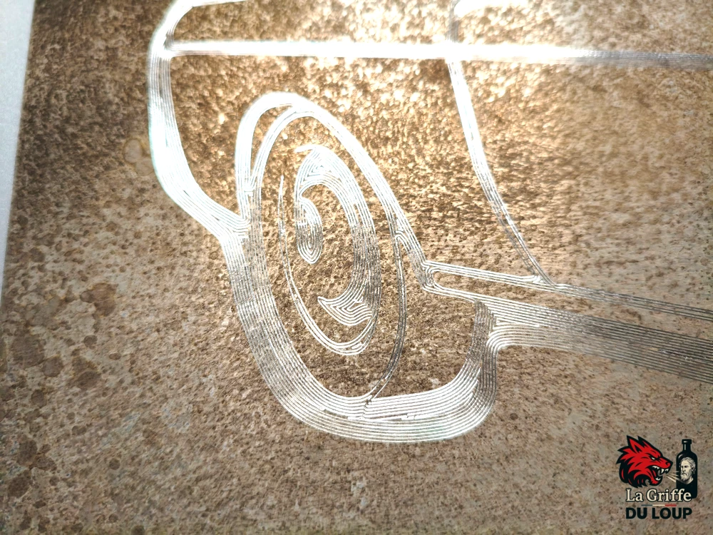 Je l’ai gravée à la pointe diamant ce qui donne un effet visuel incomparable selon l’angle de vue et de la lumière.