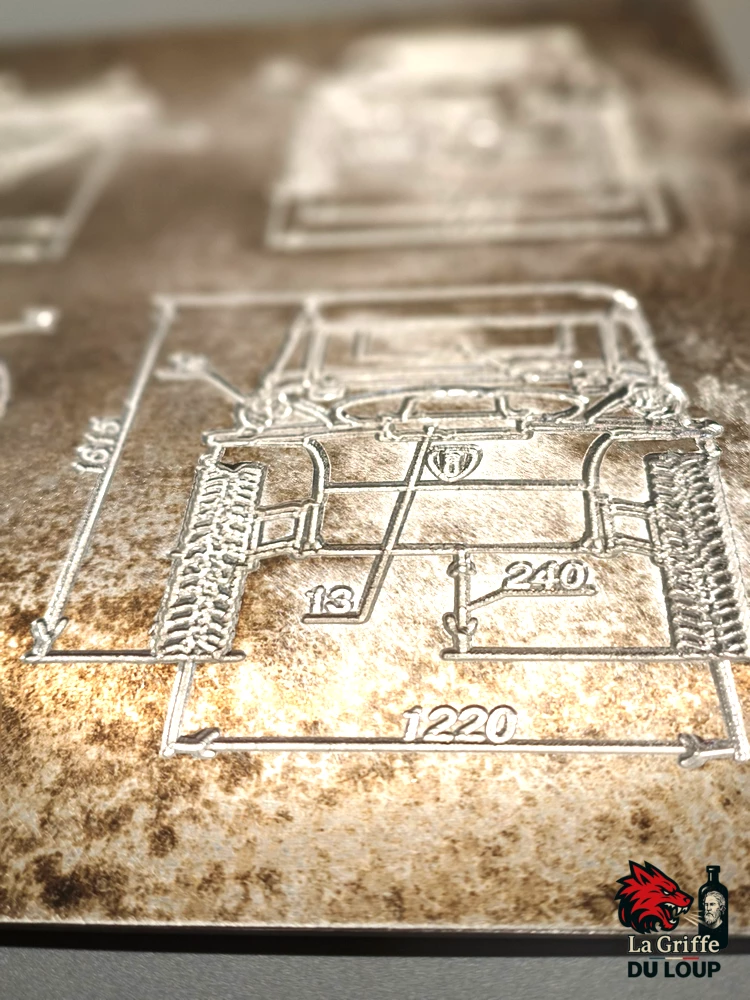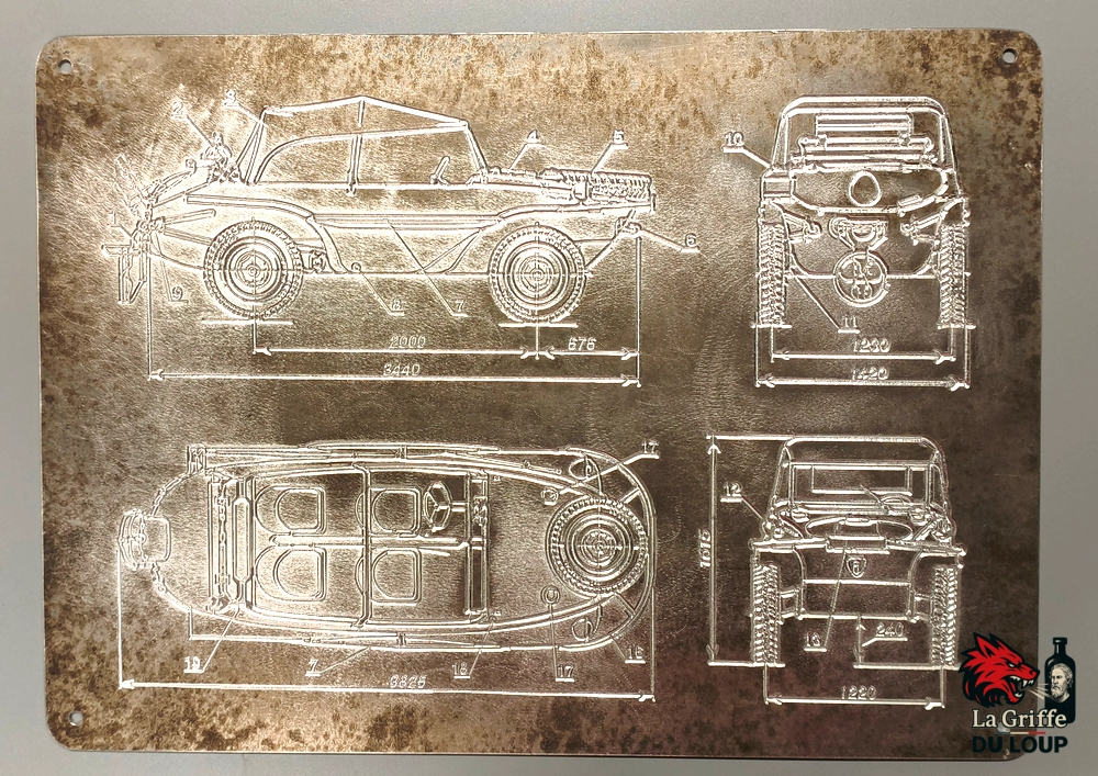 Magnifique plaque avec le plan du Schwimmwagen Volkswagen 4 vues en ALU oxydé.
