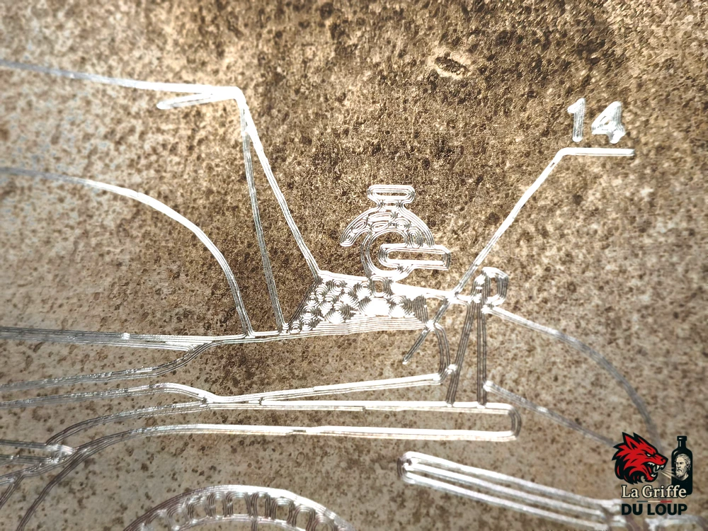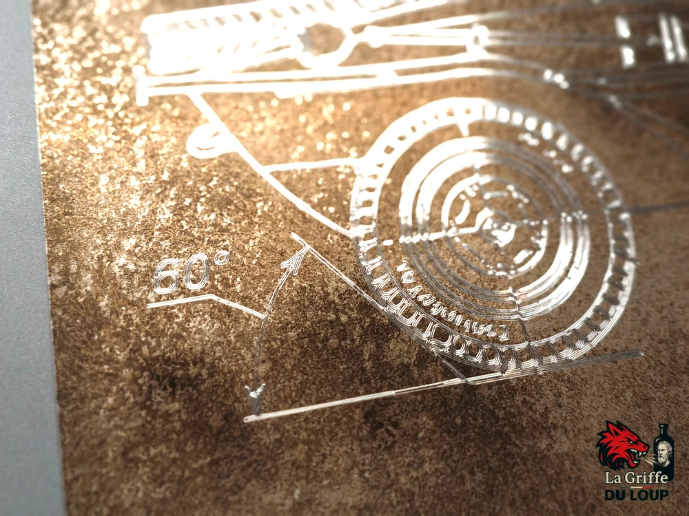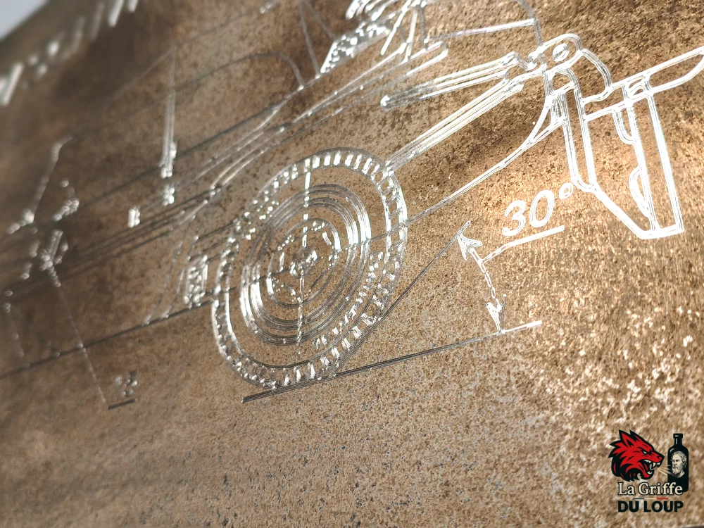Je l’ai gravée à la pointe diamant ce qui donne un effet visuel incomparable selon l’angle de vue et de la lumière.
